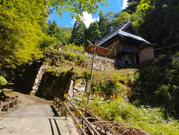 グーグルマップによれば、「玉岩地蔵堂」の手前に「玉岩地蔵堂駐車場」があるのですが、往路では気づかずに通過してしまいました。幸いエスケープゾーンの広い場所があり、そこにバイクをUターンして駐めました。この先「玉岩地蔵堂」までも狭いながらも舗装路なのですが、バイクでもUターンに苦労しそうな道幅だったので賢明な判断でした。