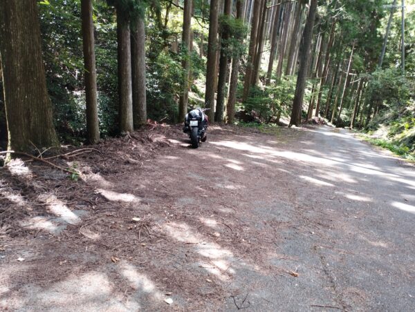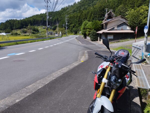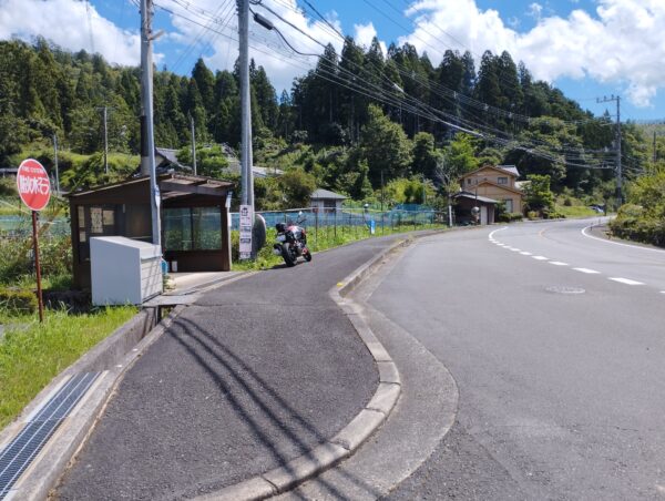 バイクは府道19号線のバス停に駐めています。バイクの後方が日吉ダムのある方向です。「国師岩」は下の写真の中央やや左上に見える白い看板のあるところが入口になります。