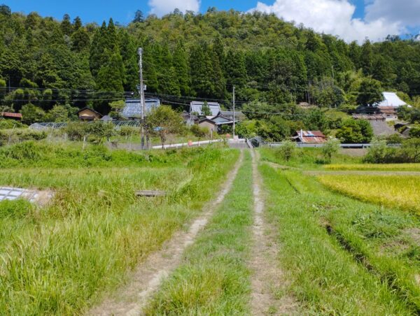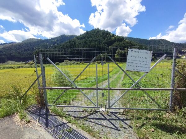 「国師岩」からの帰り道。害獣対策フェンスに向かってたんぼ道を歩いています。害獣対策フェンスは仮施錠だけしておいたので、通過後しっかり施錠しておきました。