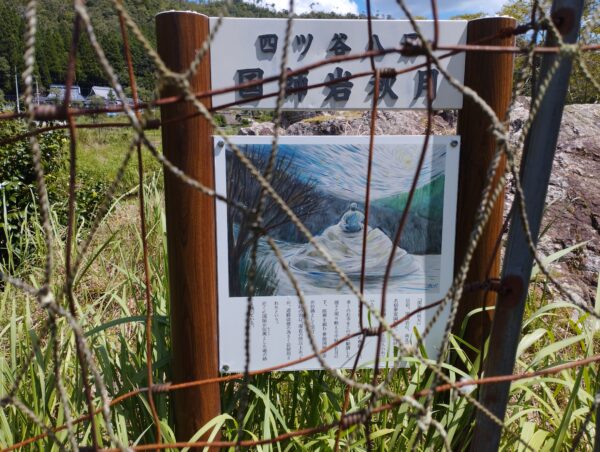 「国師岩」の入口は害獣対策フェンスで閉ざされていますが、開閉して入ることができます。