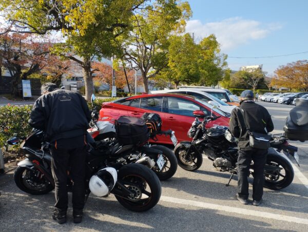 「彦根城」にはいくつか駐車場があるのですがほとんど満車状態だったため、わたし達は「桜場駐車場」に向かいました。しかしバイクを駐車可能かわからなかったため、グーグルマップで最寄りの無料駐車場を探して「彦根市立図書館」の駐車場に駐めました。「市立図書館」の駐車場も「彦根城」の外堀の内側にあるため、かなり便利な場所にありました。