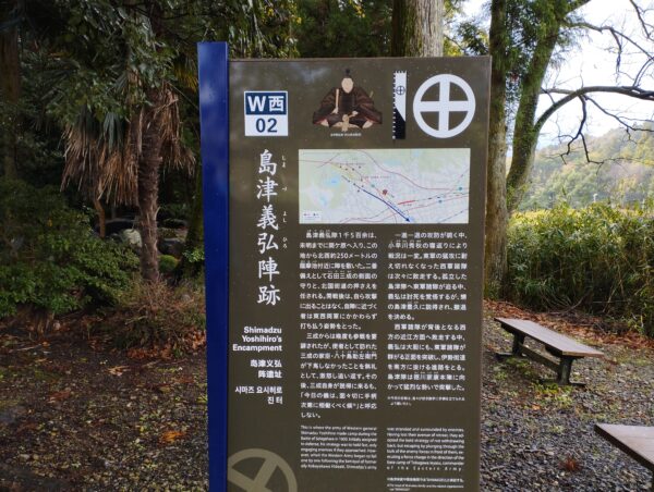 「島津義弘陣跡」の説明看板は、島津の家紋が掲載されていました。まあ当然ですね。2023年の大河ドラマは「徳川家康」でしたが、敗走する島津勢が突っ込んできて「家康」が慌てるシーンなどもあったのでしょうか。