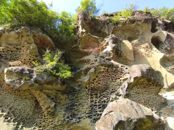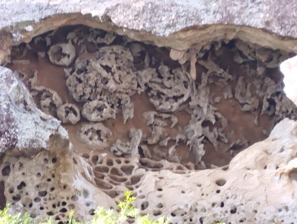 説明看板によると「虫喰岩」は塩分の再結晶時に表面が剥がれ落ちてできたという説があるようです。