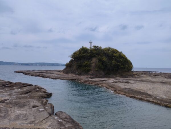 「天神崎丸山灯台」です。この小山は標高16mです。「島」じゃなくて「山」なんですね。もちろん地続きで登山口もあるらしいです。