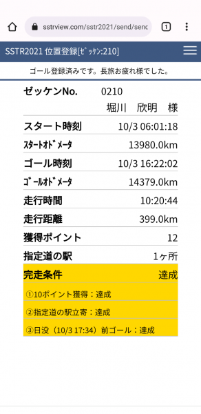 10月3日にSSTRに参加して、無事完走しました。