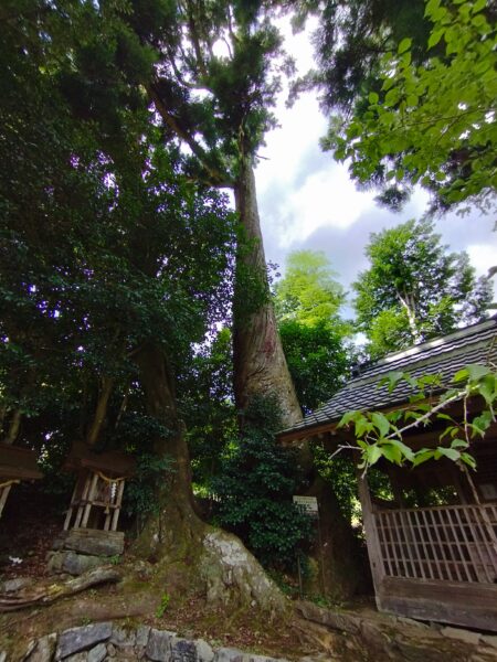 社殿です。ちょっと大きい祠って感じですね。社殿を挟むように巨大な杉が生えていますが、向かって左側が「ねじれ杉」です。幹を覆う樹皮がねじれたように巻いているのがその名の由縁です。ちなみに幹周は510cmで、「三埜菅原神社」の御神木より太いですね。