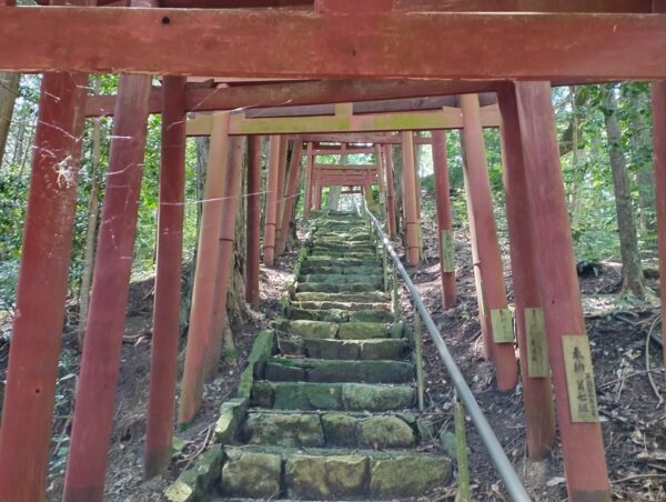 参道は階段ですが。さすがはお稲荷様、赤い鳥居がずらりと並んでしました。ずらりと並ぶ赤い鳥居と言えば京都の「伏見稲荷神社」が超有名ですが、お稲荷様ってこういうものなんですかね?