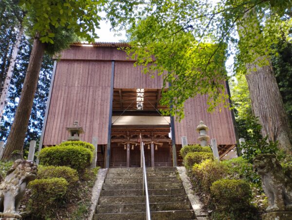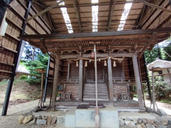本殿です。社殿か囲われているので修復工事中なのかと思ったら、ここも「山神神社」と同様に風雨から社殿を守るための囲いのようでした。