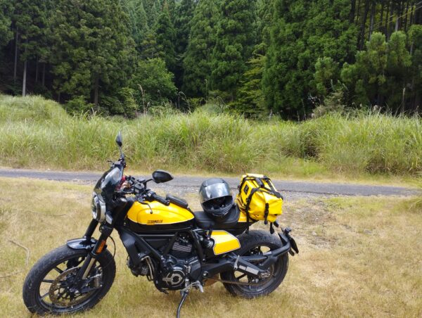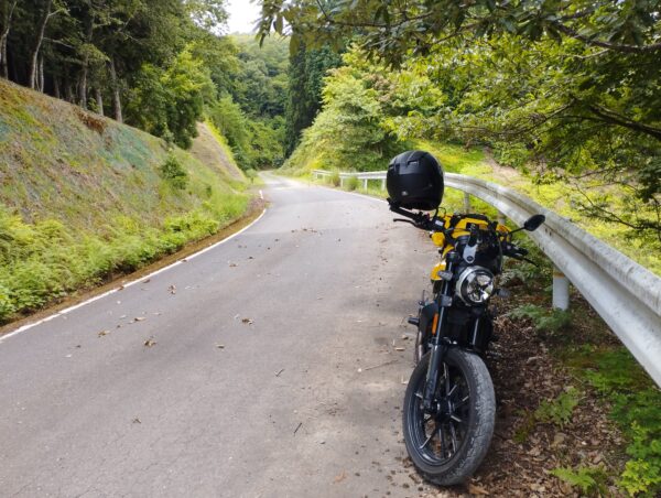 こういう道を走るためにスクランブラーに買い換えたんだ!、と走り始めましたが、数キロ毎に舗装路とダートが入れ替わる林道で、「F900R」だったら絶対死んでました。子鹿は走っているわ、土砂と倒木が流出して30cmくらい堆積して道を塞いでいるわで、なかなかスリリングな林道でした。他の車両にはまったく出会いませんでした。