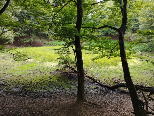 送電鉄塔まで登って、さらに進んで少し降った所に「蛇ヶ池」があります。水がないので、草の生えた湿地帯にしか見えません。特に説明看板もなく、名前の由来はわからないままでした。