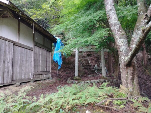 草むらを抜けると鳥居と参道の階段があります。左の建物は社務所だと思いますが、倒壊寸前の趣です。