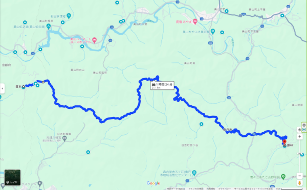 次は「八幡宮」で向かうのですが、グーグルマップは来た道を戻るルートを指示しています。同じ道を走るのは嫌なので、「丹波広域基幹林道」をこのまま進んで京北まで向かうことにしました。走り出してすぐグーグルマップの経路が「丹波広域基幹林道」経由に切り替わったのですが、「八幡宮」までの距離が25kmくらいと表示されていました。確か来た道を戻れば20kmもなかったような・・・。