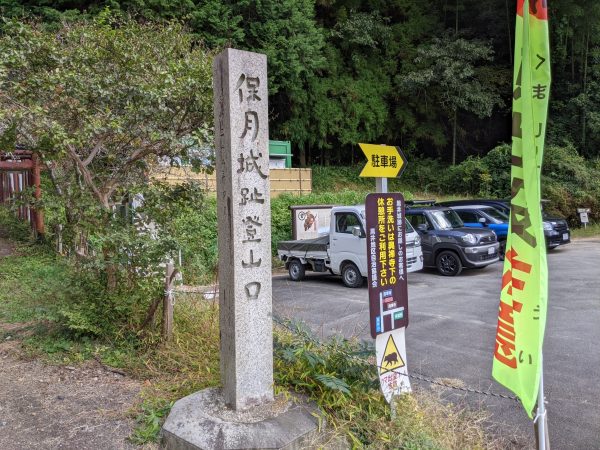 ここが駐車場。「黒井城址 (正しくは「保月城址」と言うらしい。)」までは山を登るのですが、なんか「登山口」とかいう不穏な文言が書いてあります。かなりいやな予感がしたのですが、まあそんなに高くないだろうと登ることにしました。