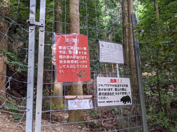 いきなり現れる不穏なゲート。2カ所に鍵(ひっかけるだけのもの)が付いています。自分で開けて、通ったらゲートを締めて、反対側から手を突っ込んで鍵をかけます。ここにたどり着くまでに下山する人とすれ違っていなければ、山が閉鎖されていると思うところでした。