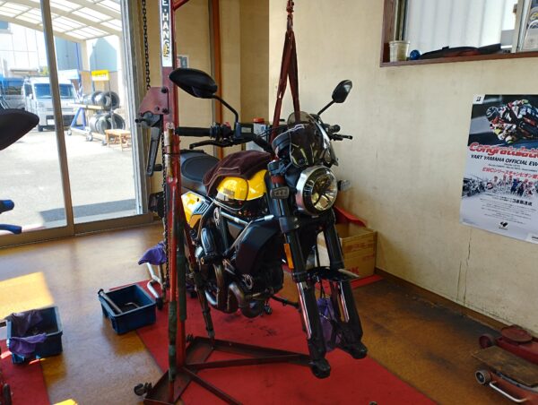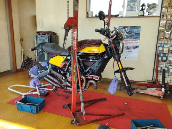 前後輪のタイヤを外して交換中の様子。後輪はスタンドで、前輪はキャリアで浮いています。このバイクはナンバープレート付きの泥よけがスイングアームに付いているので、タイヤ交換時に外す必要があるため、ちょっと工賃が高かったです。