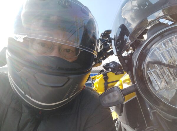 西からの日差しで後光が射していますが、年賀状は次回で最後にする予定なので、愛車と一緒に元気な様子を見せようと思っています。もうぢぢいなので、これくらい顔がわからない方がいいかもね。