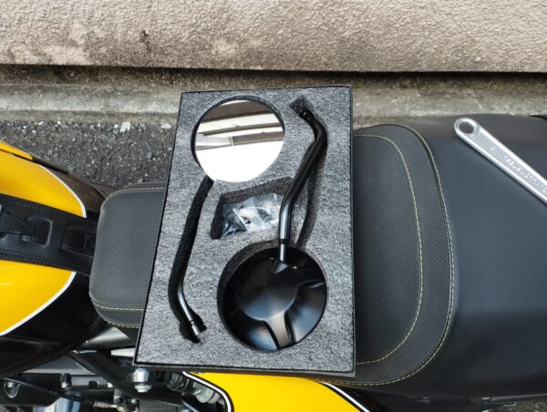 次は「Ali Express」から届いていた「ユニバーサルCNCモーターサイクルバックミラー」に交換します。中華パクリ品なのに、結構まともな梱包に入っていました。