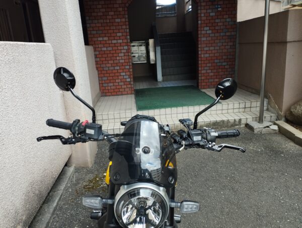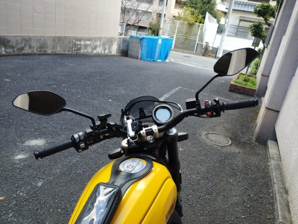 早速交換してみました。このミラーのボルトは16mmで、うちにはそのサイズのレンチなく、モンキーレンチで代用しました。何かの機会に買い足しておこうと思います。あと、「Ali Express」ではスクランブラー用っぽい感じで売っていたのですが、商品名のとおり「ユニバーサル」な商品で、右ミラーは逆ネジではありませんでした。そのため高さを合わせるために左右にアダプタを付けてから装着しました。