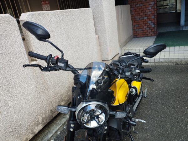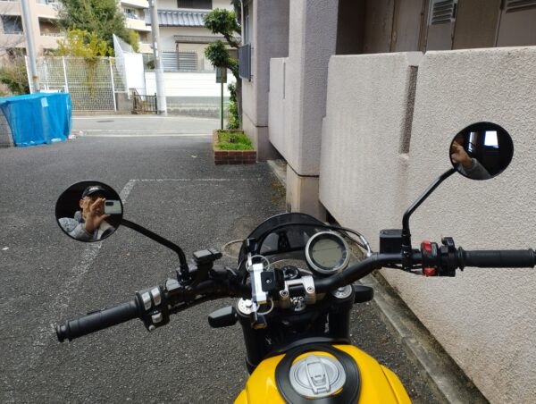 まずは純正ミラーはこんな感じです。(比較用に前後から撮影しておきました。)横に長めのミラーで格好良いのですが、ちょっとクラシックなデザインのスクランブラーには似合わないなあという印象です。