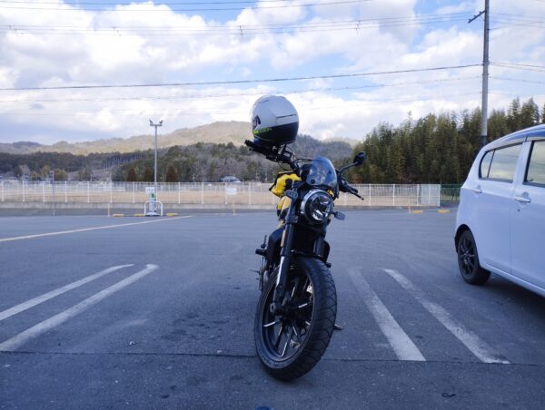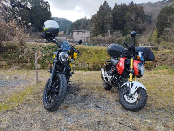 まずは「野間の大けやき」に向かいました。以前からグーグルマップには登録していたのですが、今回やっと見ることができました。R477から府道4号線に入って少し走ると「野間の大けやき」です。道沿いの駐輪場は自転車専用だったので、ぐるりと回ってバイク用駐車場に駐めました。先客はHONDAの「GROM」でした。結構カスタムが入っていました。ブロックタイヤに交換しているので、気分はスクランブラーでしょうか。