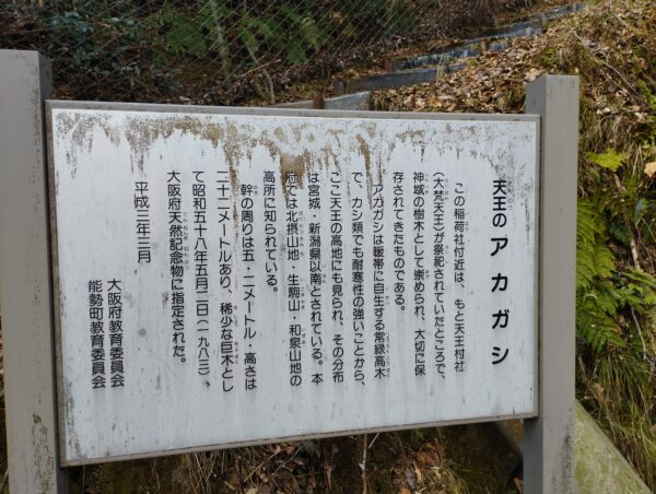 R173から階段を上がると「天王のアカガシ」の説明看板があります。「天王稲荷」付近は、昔は「天王村社」の神域だったらしく、くだんの「アカガシ」は御神木だったようです。