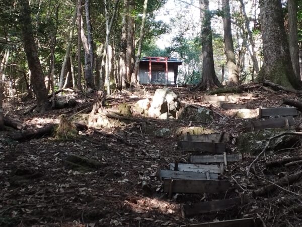 まずは「天王稲荷」へ向かいます。参道は木製の板で簡易的な階段が設けられていますが、ところどころ壊れています。