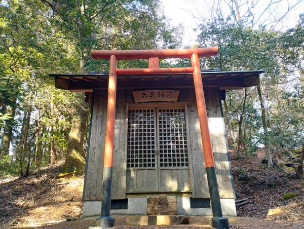 「天王稲荷」の鳥居です。鳥居の向かって左の柱の前に「アカガシ」への案内看板があります。左手に数分歩けば「アカガシ」にたどり着きます。