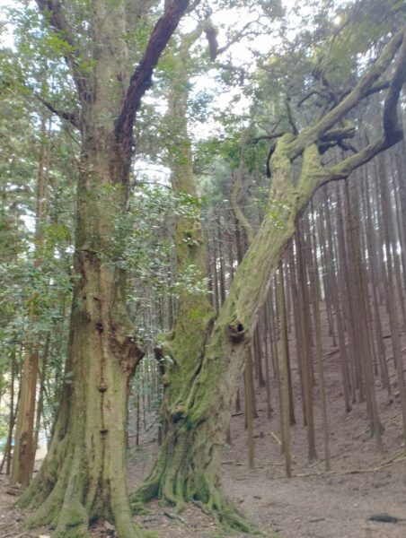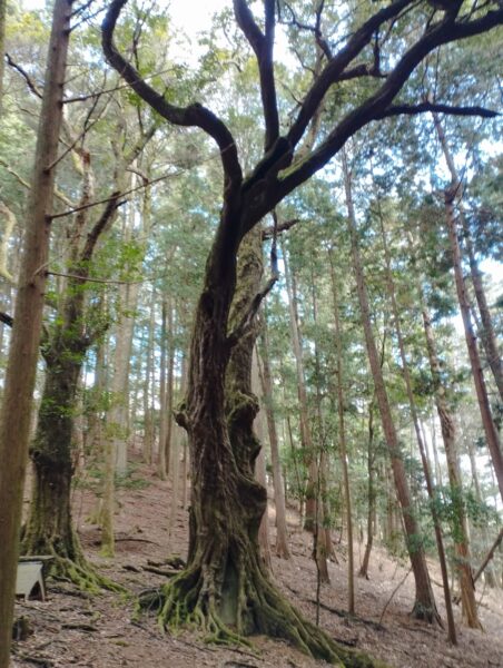 参道を降りて、最初の鳥居を出て右手に数分歩くと「天王のアカガシ」があります。山の中ですが、存在感がすごいので間違えようがありません。