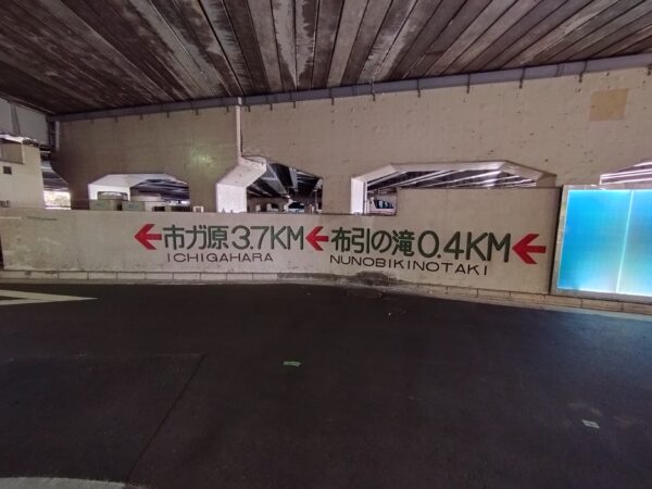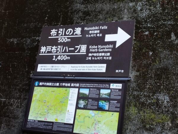 JR茨木から快速電車で「三ノ宮」駅で下車し、神戸市営地下鉄に乗り換えて「新神戸」駅に行きました。地下鉄から新幹線「新神戸」駅方面に歩いて行き、バスターミナル付近から「布引の滝」へ向かいます。目印は下の写真にある案内看板です。なぜ駅前の案内看板で400mだった距離が、その後の案内看板で500mに増えるのかは謎です。