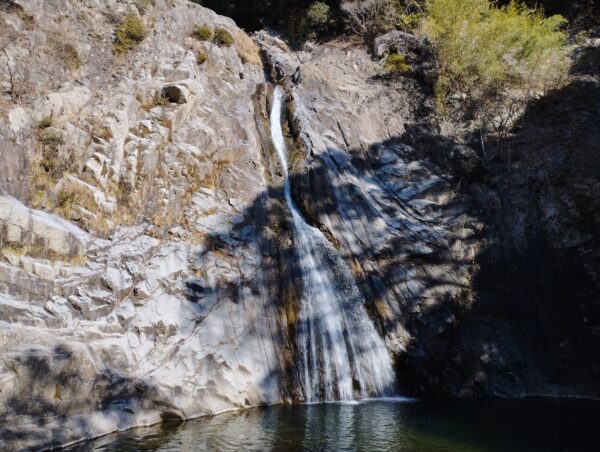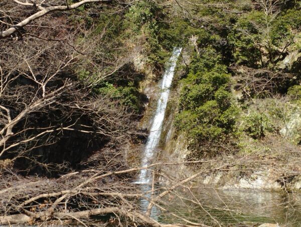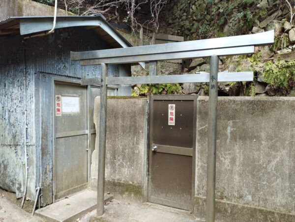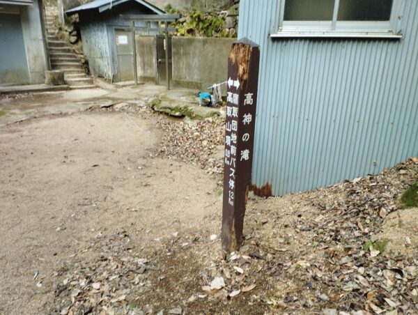 「高神の滝」に到着しました。向こうに鳥居と倉庫のような建物が見えます。