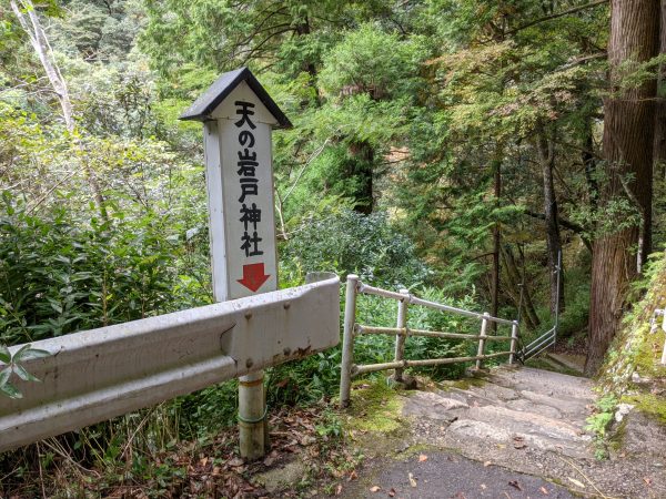 「天岩戸神社」は川沿いにあるため、道から階段を降りていきます。