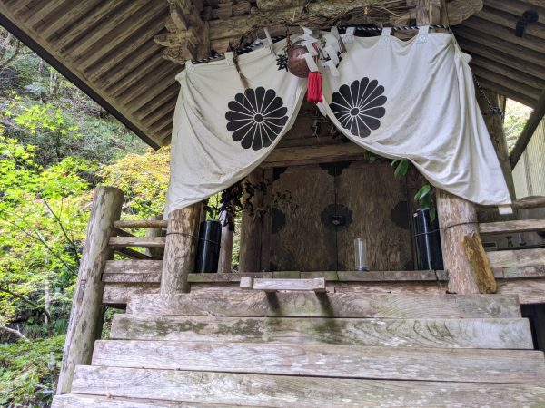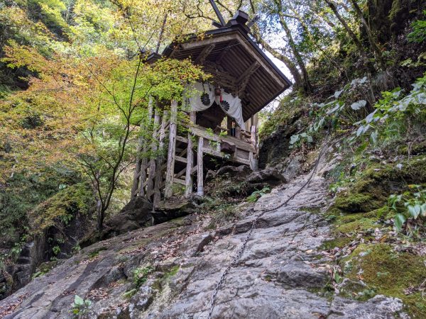 川沿いの壁面に本殿があります。参拝するには鎖を伝って斜面をよじ登る必要があります。どこに「天岩戸」があるのかは定かではありませんが、この社殿の裏側とかなのかもしれません。(裏へは回り込めません。)