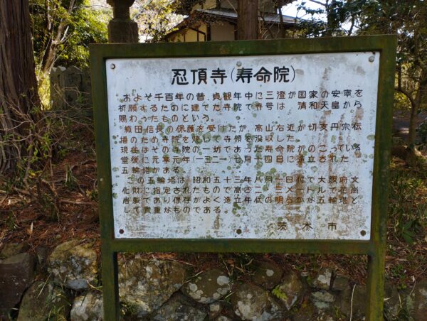 「忍頂寺」の前にある説明看板です。織田信長の保護を受けたけど、キリシタン大名の高山右近が寺院を焼いて寺領を没収したとあります。高山右近については、2023年3月に「高山城址」を訪問したことがありますね。