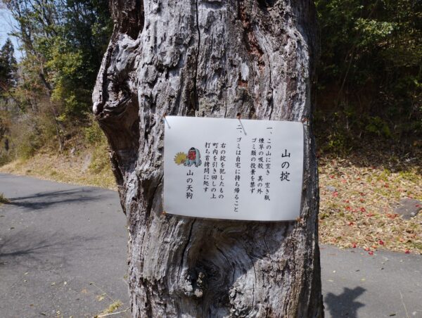 ロータリーの中心の枯木の貼り紙です。「山の掟」が記載されています。「山の天狗」さまによると掟を犯すと町内を引き回しの上、打ち首獄門だそうです。