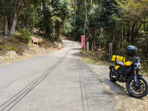 次は「宝池寺 八大竜王宮]へ向かいます。バイクを駐めた場所は、お寺の参道の手前です。ここから先は宅配便等業務用の車両以外は立入禁止だったので、手前でUターンして駐めました。この場所はUターンするためのロータリーになっています。