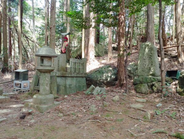 「穴仏」から約6分で「負嫁岩」に到着しました。昔、辛い仕事が嫌で、口実を設けてはこの岩の上でさぼっていた嫁が、この岩を住処にしていた「山の天狗」に見つかって、松の木に縛り付けられて餓死したとのことです。バイクを駐めた場所にあった「山の掟」といい、「山の天狗」さまはなかなか厳しい方のようですね。