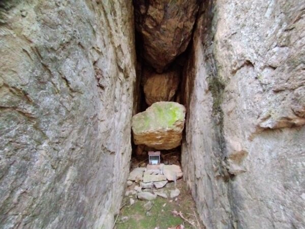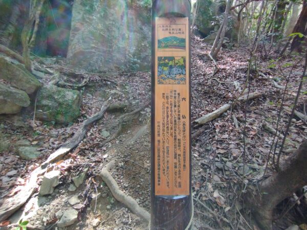 「瀧不動明王」から約8分で「穴仏」に到着しました。「穴仏」は自然歩道から山を登った場所にあり、斜面が急なため補助用のロープが設置されていました。戦国時代に戦乱の被害を避けるために「忍頂寺」の薬師如来を岩穴に避難・安置したことから、その場所を「穴仏」と呼ぶようです。