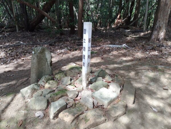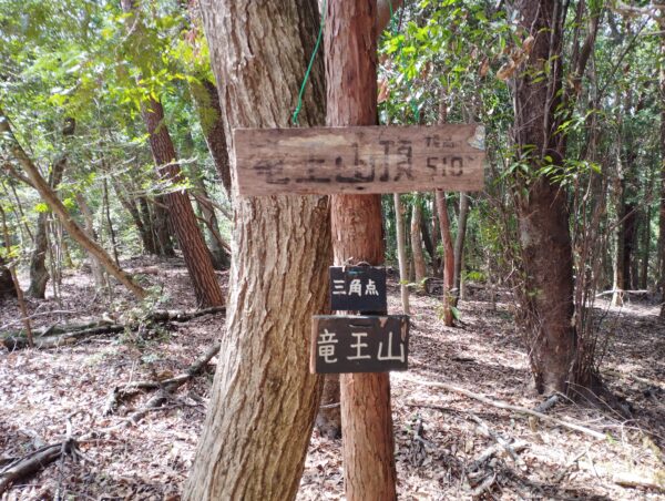 往路では「竜王山」の山頂を確認していなかったので、復路で「三角点」にやってきました。「竜王山」は標高510mなんですね。往路はかなり高い位置までバイクで来ているので、登山の実感がなかったのですが、復路は「負嫁岩」から「三角点」まで約23分登っているので立派な登山でした。