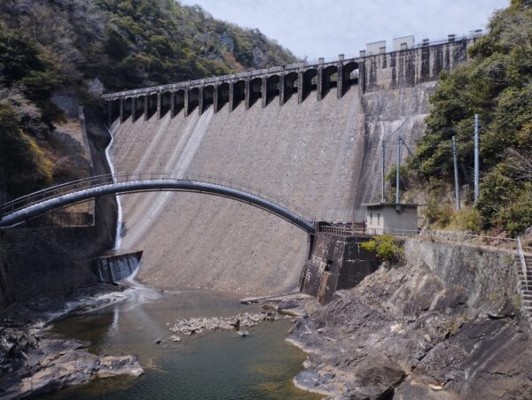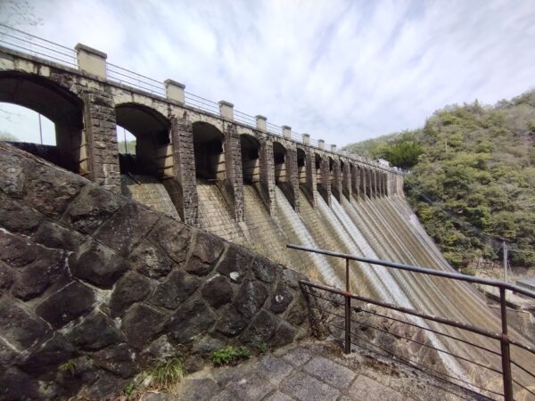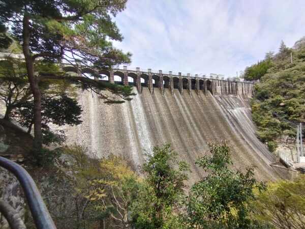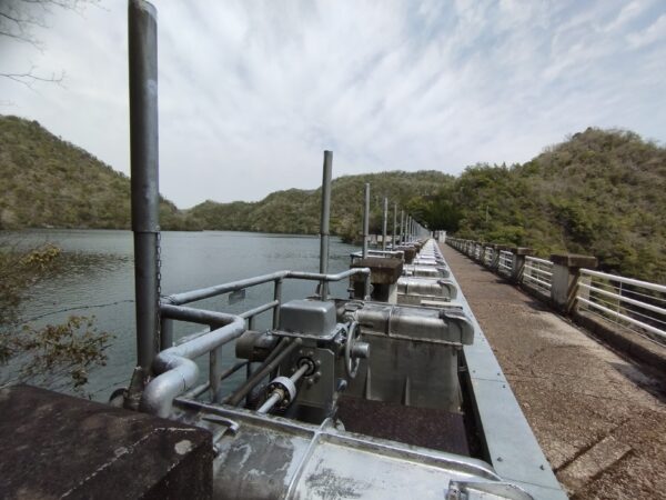 ダムの上部まで遊歩道が設けられており、えん堤まで上ることができます。えん堤の手前から見たダムはこんな感じです。