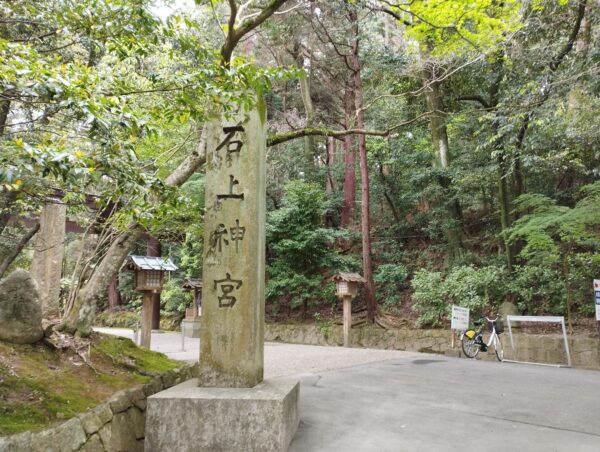 駐車場の横から参道に向かいました。「石上神宮」と書かれた石柱のところを左折すると参道に入ります。