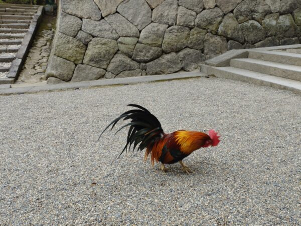 境内には鶏が多数放し飼いになっており、まだ朝なので「コケコッコー」と賑やかでした。