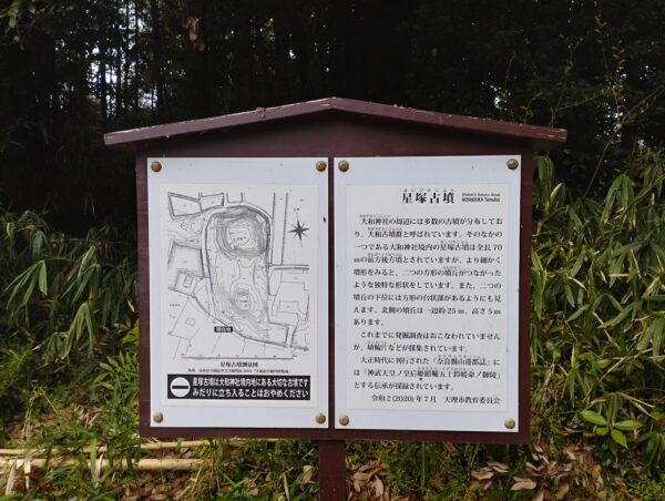途中に「星塚古墳」の説明看板がありました。この看板の向こう側が古墳のようですが、林状態なのでよくわかりません。