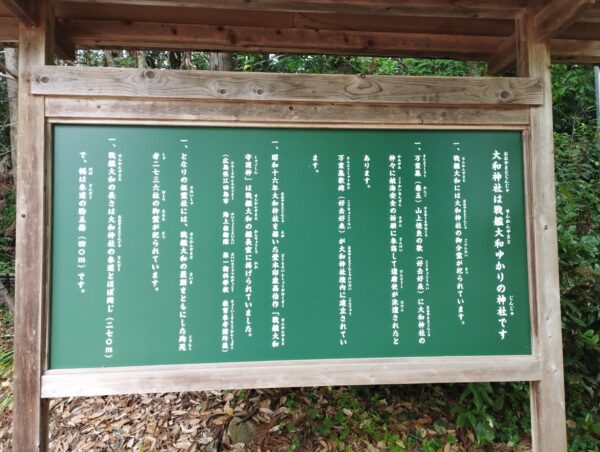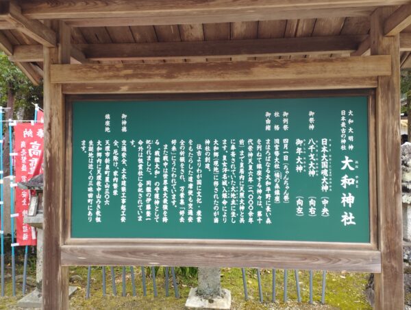 「大和神社」の説明看板です。「日本最古の神社」とありますが、奈良だと日本最古級がありすぎて、ありがたみが減少してしまいますね。