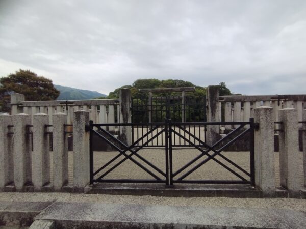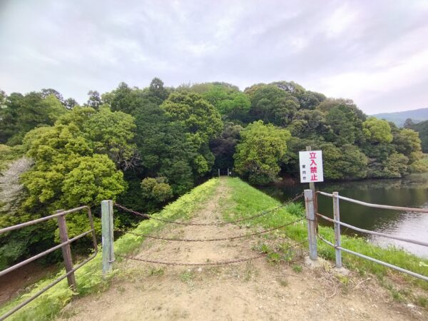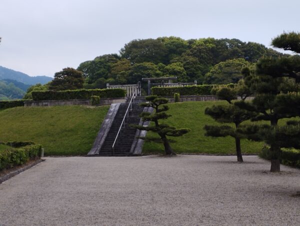 階段の上は閉鎖されていて、この先に立ち入ることはできません。正面に見えているのは古墳の前方部です。