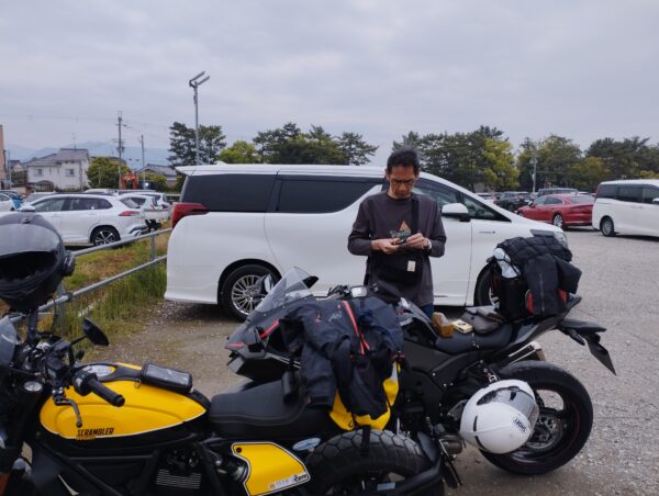 待合せ相手のM氏が11時丁度にやってきました。彼は「第5駐車場」にバイク専用の駐輪スペースがあるのに気付いて、わたしが駐めていないか確認したそうです。ちなみにM氏は「ゆるキャン△」と「ワークマン」のコラボTシャツを着ています。