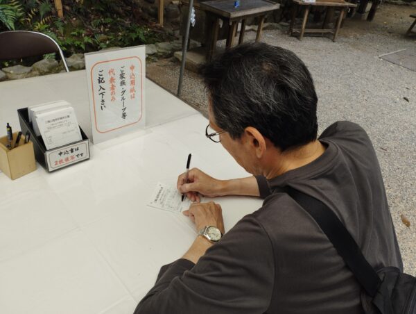 代表して「登拝届」を記入するM氏です。「登拝届」は複写紙になっていて、下山した後で2枚目を「下山届」として提出します。