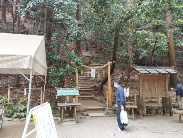 ここが「登拝口」です。「登拝届」を提出すると白いたすきを受け取り、それを首に掛けて、登拝の注意を聞いた上で登ります。登拝口では、神主さんがお祓いをする「紙垂(しで)」を左・右・左に降って自身を清めてから登ります。