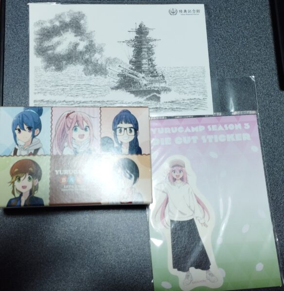 左の「ゆるキャン△」の箱は「チョコビス」というチョコクッキーで、これもコラボ商品ですね。中に「斎藤恵那」ちゃんのステッカーが入っていました。(光って見えないけど、パッケージの右下の子ですね。あと受取りが遅れたせいで賞味期限が切れていました。)