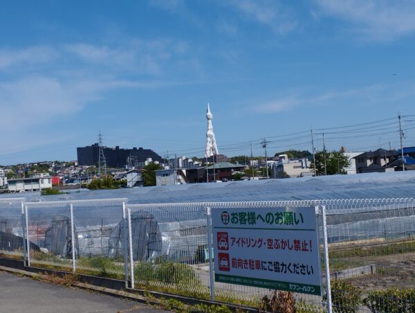 今回は友人のM氏と「伏見峠登山口」近くの「バイク無料駐車場」に10時待合せです。途中の「セブンイレブン富田林西板持店」でコーヒー休憩と昼食の調達をしました。コンビニから白い塔が見えたのですが、後でM氏に聞いたところ「PLの塔」らしいです。