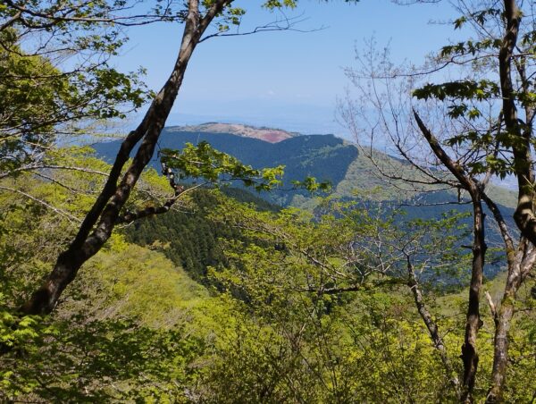 道しるべ付近から見た「奈良方面」の景色です。中央付近で赤く見えるのはツツジの花らしいです。